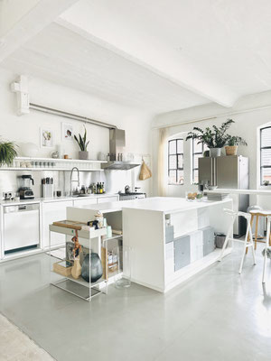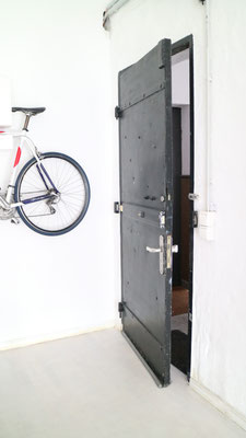 In der Küche liegt ein grauer Turnhallenboden, im Wohnbereich (Hauptraum) ein heller Parkett. Im Nebenraum (weiß gestrichener Betonboden)